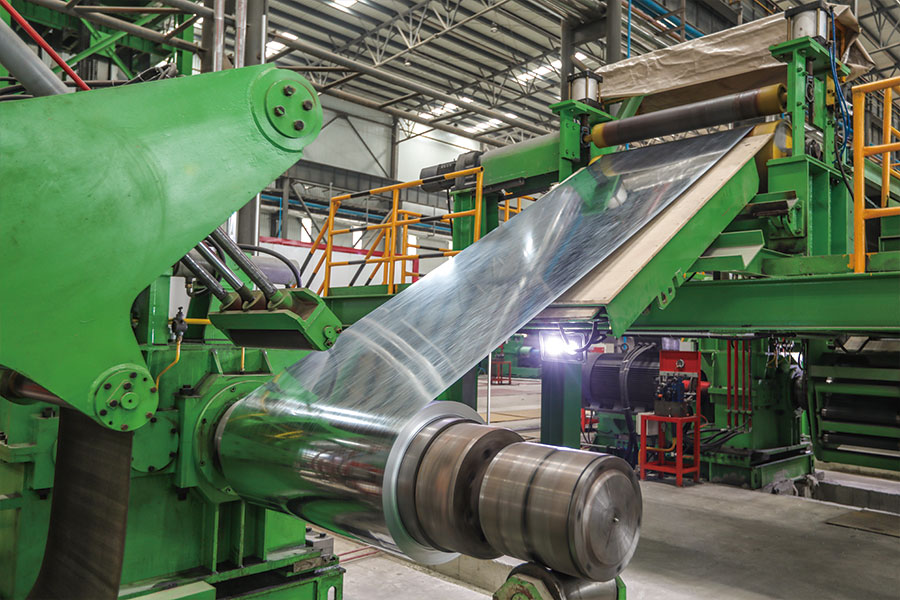 公司擁有4條熱鍍(鋁)鋅機(jī)組,機(jī)組均采用改良森吉米爾工藝。具有良好的在線鍍層厚度控制設(shè)備及各關(guān)鍵工序的質(zhì)量控制手段,保證產(chǎn)品具有優(yōu)良的鍍層控制精度、優(yōu)異的涂覆性能和焊接性。工藝流程是冷軋帶鋼經(jīng)清洗段清洗表面并烘干后,進(jìn)入直接火焰加熱和輻射間接加熱相結(jié)合的改良森吉米爾熱處理進(jìn)行退火及還原,然后在密閉狀態(tài)下進(jìn)入鋅鍋進(jìn)行熱浸鍍,經(jīng)過氣刀實(shí)現(xiàn)鍍層厚度控制,并經(jīng)鍍后冷卻過程,獲得鍍鋅帶鋼。 通過光整機(jī)、拉矯機(jī)改善鍍層表面質(zhì)量和帶鋼的機(jī)械性能與平直度,滿足特定的要求。根據(jù)用戶要求,后處理段還可以實(shí)現(xiàn)鈍化、耐指紋和涂油處理,最終得到成品鍍鋅卷。